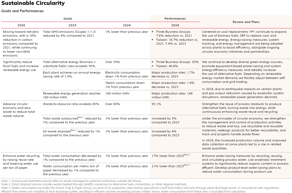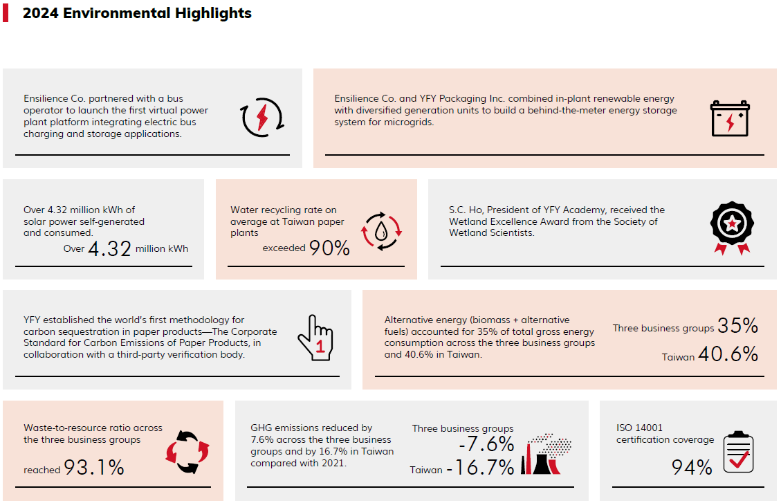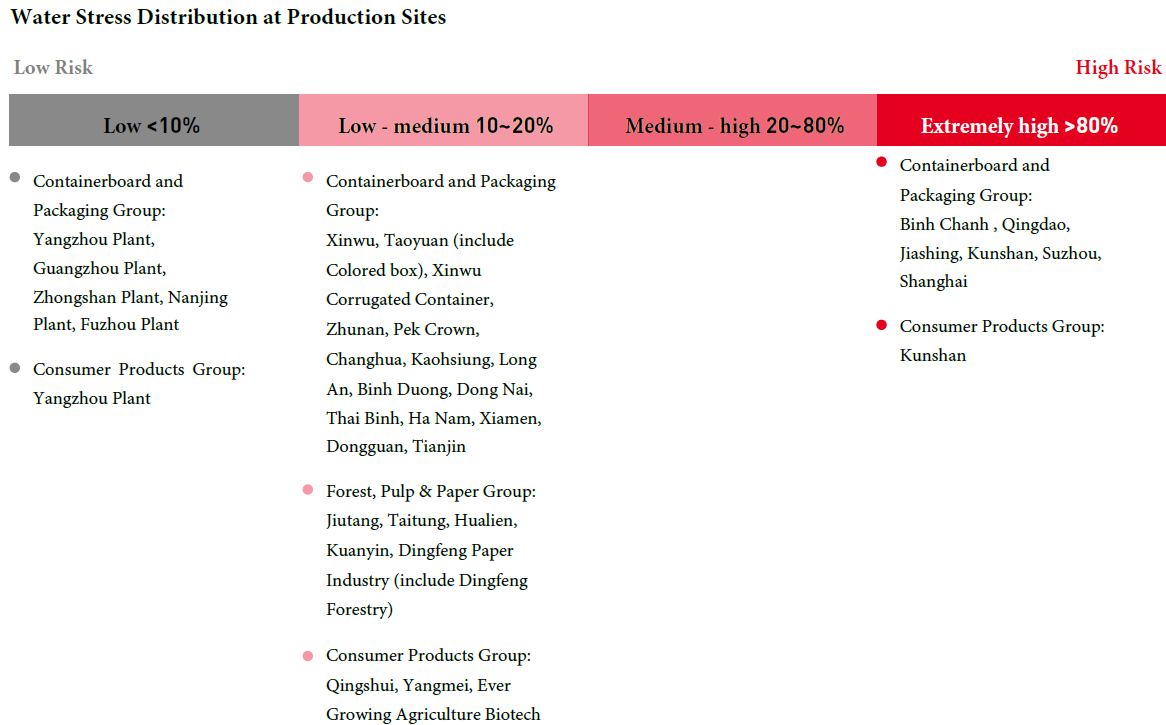 The Group’s environmental management, performance, and risk information are organized by its three major business groups—Forest, Pulp & Paper, Containerboard & Packaging, and Consumer Products—covering key production bases in Taiwan, China, and Vietnam. Issues such as water management and emissions are implemented and disclosed at the site level under the ISO 14001 framework.