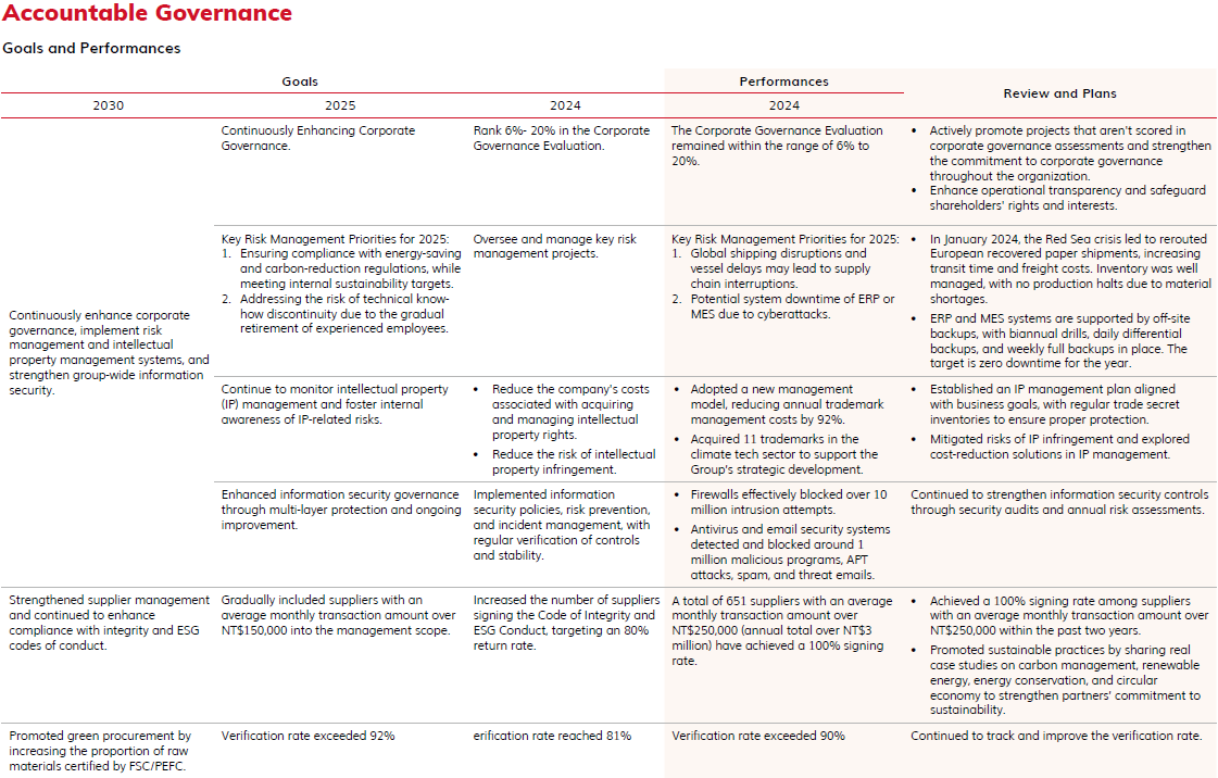 The company has established "Risk Management Policies and Procedures," with the Sustainability Development Committee overseeing risk management in accordance with these policies. This committee includes a risk management group responsible for driving risk identification and management across various areas, including finance, operations, information security, and legal compliance. We provide regular reports to the board of directors. On November 13, 2023, we presented the board with an overview of the risk management organizational structure, procedures, and operations. Additionally, on November 13, 2024, we reported on the operational performance for the current year. We will continue to develop, implement, and refine risk management strategies and monitor their effectiveness. For detailed information on the operation of our risk management policies and procedures, please refer to P.99-P.100 of the annual report.