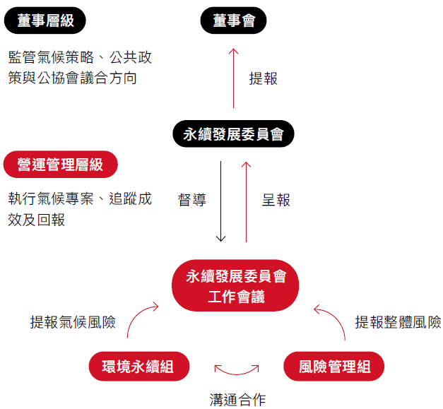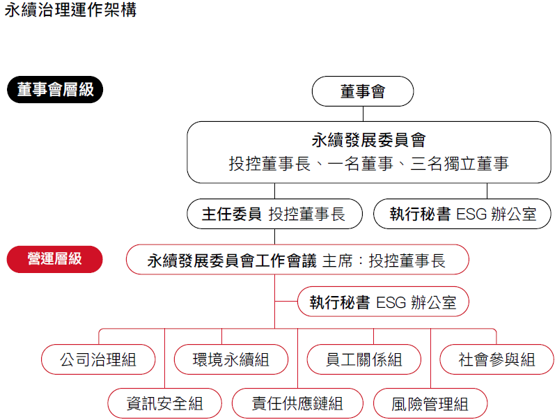 董事會下設有「永續發展委員會」功能性委員會,由董事長擔任主任委員,一名董事及三名獨立董事擔任委員。委員會督導七大功能任務,各功能皆由投控高階主管代表統籌運作,其中環境永續組主導氣候風險與機會評估及策略,而風險管理組則與環境永續組即時橫向溝通,以確實掌握集團氣候風險議題及管理。由董事長帶領各功能高階管理層,不定期召開工作會議,統籌事業群對應的功能部門成員執行,共同推動與營運及氣候相關之風險評估和內部管理。委員會執秘ESG辦公室每年定期向委員會及董事會呈報,接受董事督導與建議。