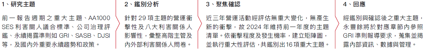 永豐餘依重大性原則,規劃每三年重新鑑別重大主題,呈報永續發展委員會核准後,做為永豐餘年度專案以及利害關係人溝通促進的重要參考,並擬定主要管理方針與執行計畫,以回應利害關係人的需求與期待。每年仍定期檢視永豐餘營運是否對環境、社會與治理產生新的衝擊。2024年並無申訴案件發生。