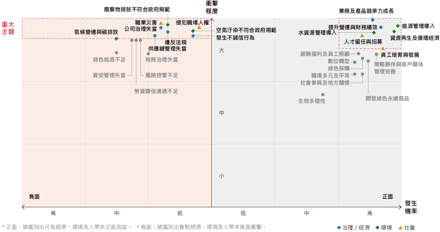 29項重大主題中,15項主題被鑑別出可帶來正面效益,14項主題可能帶來負面衝擊。整體而言,正面主題主要落在「衝擊程度中大,且發生機率中高」的象限範圍內;負面主題主要落在「衝擊程度大,但發生機率中低」的象限範圍內。針對正面主題,綜合考量其衝擊程度及發生機率,以兩軸分數相乘所得之重大性評分進行排序。針對負面主題,優先考量其後果深遠且難以補救的特性,故以衝擊程度將負面主題進行排序。2024年共鑑別出16項重大主題,如矩陣圖所示。