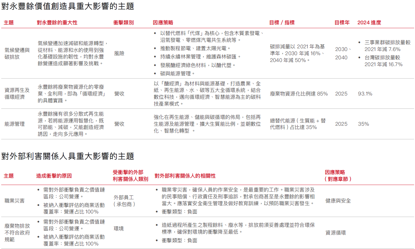 永豐餘將氣候變遷議題融入營運策略,鑑別與永豐餘相關之短、中、長期氣候風險與機會議題,以掌握氣候變遷對財務的衝擊,規劃因應策略。財務影響、成本或收入預估等相關機制,規劃依金管會時程於2027年前導入,接軌IFRS S2揭露要求。