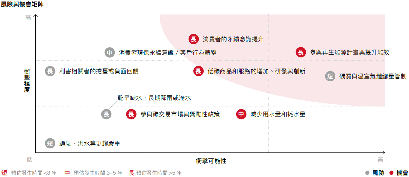 我們參考國際氣候事件與產業趨勢、國內外法規政策或指引、權威機構研究、國內外同業標竿企業報告等,鑑別與紙業相關議題。接著,透過跨事業群討論及工作坊,依循TCFD重大性評估方法,針對風險/機會的衝擊程度及衝擊可能性進行排序,鑑別出公司營運上與氣候相關之重大風險與機會,詳如風險機會矩陣所示,分布於矩陣右上角之議題屬於高風險/機會項目。