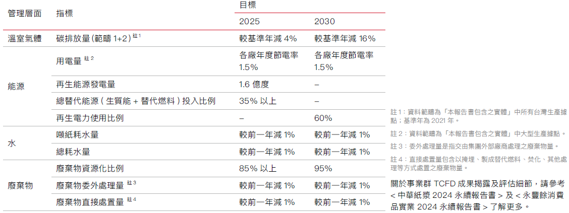 永豐餘持續從溫室氣體、能源、水和廢棄物等管理層面,制定氣候相關指標以監督管理環境績效,朝永豐餘訂定的淨零目標邁進。目前尚未使用碳抵換或再生能源憑證以達成相關目標。