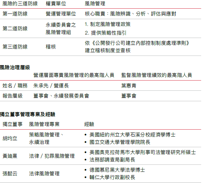 本公司亦定期向董事會報告,已於2024 年11 月13 日向董 事會報告風險管理組織架構、風險管理程序及其運作情形。 我們將持續提出、執行與修正風險管理對策,並追蹤管理狀 態。風險管理政策與程序運作情形詳2024 年報P.66、P.67。