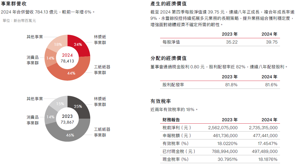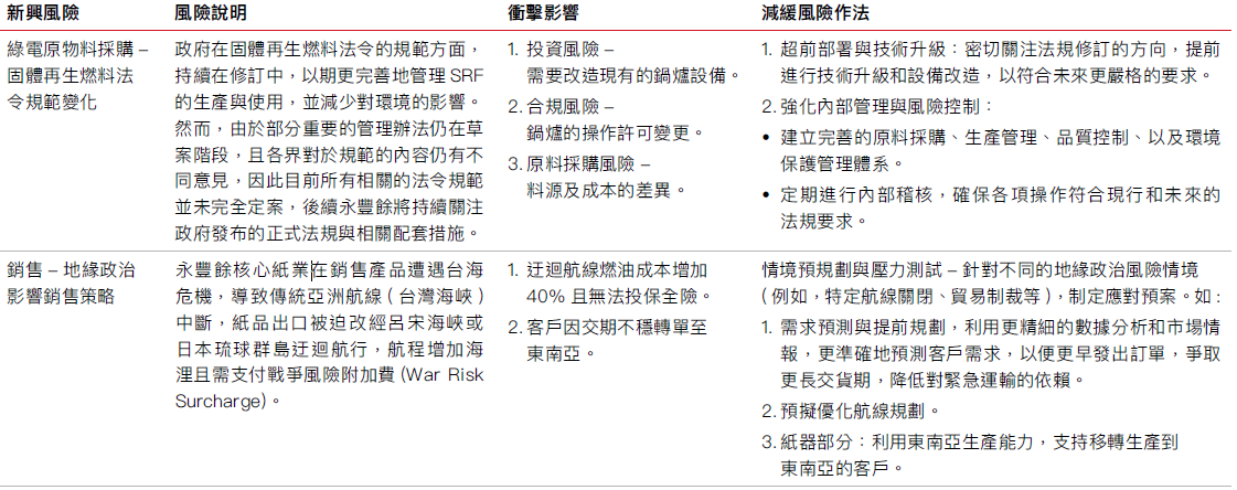 針對本公司管理與營運相關之財務風險,進行敏感度分析,包含市場( 匯率、利率、其他價格) 風險、信用風險、流動性風險等,同時,評估公司因勞基法 退休金制度所暴露之風險,包含投資、利率、薪資等風險。分析內容及結果請參考公開資訊觀測站財務報告書-1907 永豐餘113 年度第四季合併財報及個 體財報。